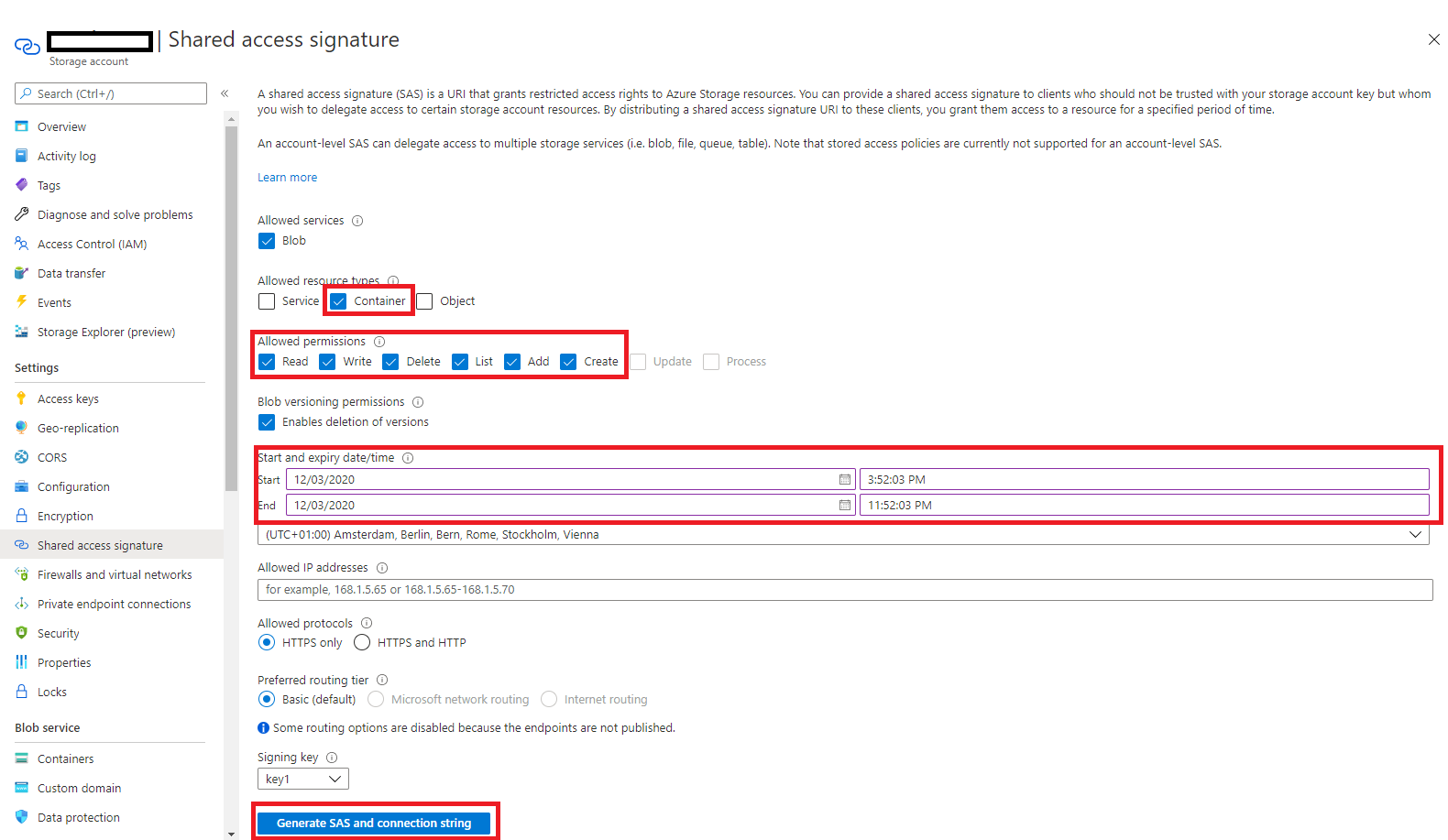 - Create a SAS which grants access to all permissions on the storage and store the generated "Blob service SAS URL" safely for later use. It is recommended to set a short time span on which the SAS will be valid for security reasons.