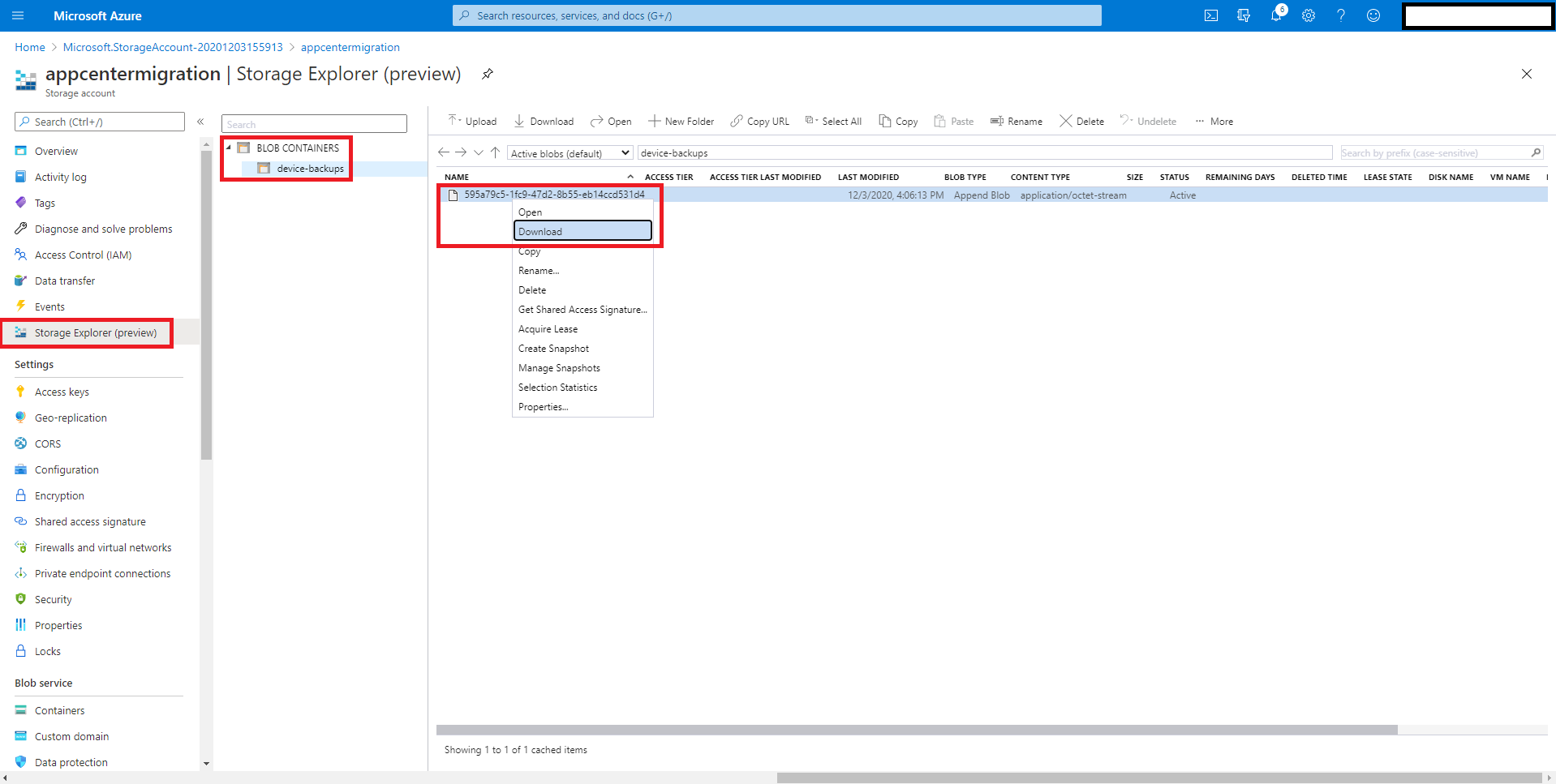 When the backup is done, you can open the Storage Explorer of your Blob Storage instance and download the backup file