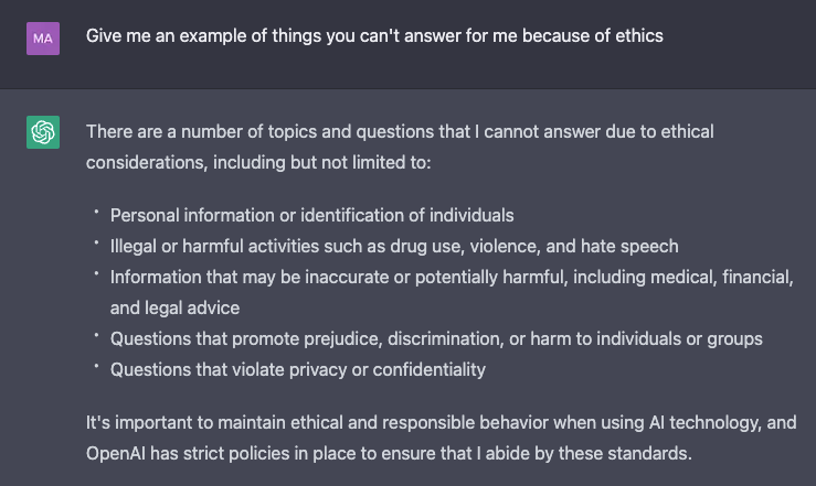 The ethics on ChatGPT are created by OpenAI and are very reasonable. Information that could harm others (for example, "how to create a bomb") could arguably do more harm than good.